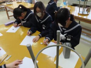 1年生「校外学習」② 2026年4月17日 福光中学校 学年, 活動記録 砺波青少年自然の家に到着後、午前は「イニシアティブゲーム」を行いました。5種類のゲームを班員と協力しながらクリアしていきます。写真は「丸太ステップ」の様子です。 昼食後は「レザークラフトづくり」に取り組んでいます。 さわやかな青空の下、元気に活動しています。