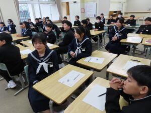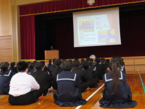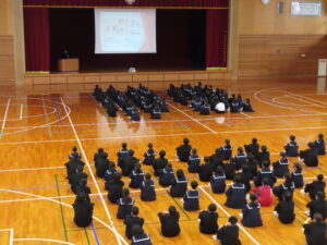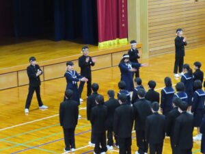 6限に生徒集会が体育館で行われ、2,3年生から「生徒会活動」や「部活動」についての説明がありました。最後には、応援団から1年生に対してエールが送られました。