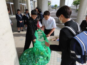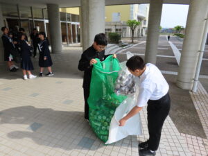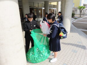 これは昨年度の活動を引き継いだものになりますが、たくさんのアルミ缶を袋に入れて登校する生徒の姿が見られました。