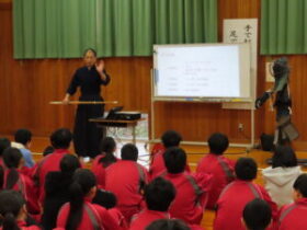 剣道の競技経験のある教頭先生も授業に参加し、オリエンテーションを行いました。「礼の仕方」や「竹刀の持ち方」など、1年生にとっては初めての学習になりました。