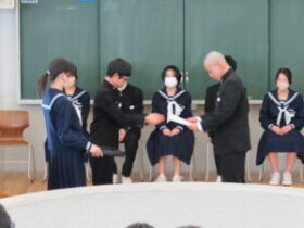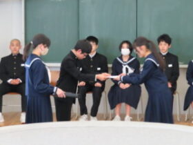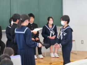 令和8年度前期生徒会役員に決まった7名に「当選証書」と「任命書」が手渡されました。