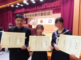 福光中学校からは、3年生3名が生徒会や学年の活動、ボランティア活動などへの取り組みに対して表彰を受けました。