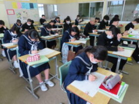 2年生は、今年度の振り返りと3年生に向けた学年集会を行いました。また、理科の授業では、先週行われた県立高校入試の問題を解く姿が見られました。どの教科も、2年生までの学習内容で解くことができる問題がいくつもあります。