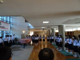1年生「朝活動」合唱練習 2025年9月30日 福光中学校 学年, 活動記録 1年生は今日の朝活動の時間に、ラウンジで学年合唱を行いました。 合唱コンクールの1年生の課題曲「夢の世界を」を、学年全体で歌いました。学習発表会の合唱コンクールに向けて、学級ごとに協力し合って取り組んでいきます。